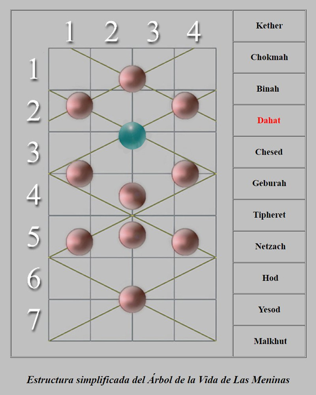 Hablamos, pues, de la causa oculta que anima al Árbol Sefirótico, un enigma que en Las Meninas tiene respuesta gracias a una cuadrícula de 152 unidades de lado, y equivalente a 3,141333... metros, con la que hemos asegurado la posición de las 10 + 1 esferas en coordenadas de números enteros.
