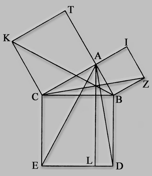 Sea el triangulo rectangulo .ABC. que tenga recto el angulo BAC. digo que el quadrado que es hecho del lado .EC. es ygual a los quadrados que ſe hazen de .BA. y de .AC. Deſcribaſe, por la .46. de la .BC. el quadrado .BDCE, y por la miſma, de la BA. y de la, AC. los quadrados .ABZI. ACKT. y por el punto A. tireſe .AL. parallela con la .BD. CE, por la propoſicion .31, y por la .I. peticion tireſe AD. CZ. y porque los angulos. BAC. BAI. ſon rectos. Luego tiradas dos lineas rectas .AC. AI. deſde vna linea recta .AB. y deſde vn punto en ella .A. no hacia vnas miſmas partes hacen de vna y otra parte angulos yguales a dos rectos por la .14. propoſition, luego en derecho eſta la .AC. de la .AI y por eſto tambien BA eſta en derecho de .AT y porque el angulo .DBC. es ygual al angulo .ZBA. porque cada vno dellos es recto; pongaſe comun el angulo ABC. Luego todo DBA es ygual a todo el angulo ZBC. y porque las dos .AB. BD. ſon yguales a las dos BZ. BC. la vna a la otra, y el angulo .DBA es ygual al angulo .ZBC. luego la baſis .AD, por la .4. propoſicion, es ygual a la baſis .ZC. y el triangulo .ABD. al triangulo .ZBC. es tambien igual. Y el parallelogramo .BL, por la 41, es doblo del triangulo .ABD porque tiene vna miſma baſis que es .BD. y esta en vnas miſmas parallelas, es a ſaber .DB. AL. y tambien el quadrado .IB. por la miſma, es doblo del triangulo .ZBC. porque tiene la miſma baſis que es .BZ. y eſta en vnas miſmas parallelas, es a ſaber .ZB. IC. y las coſas que ſon doblo de coſas yguales, por la .6. comun ſentencia, entre ſi ſon yguales. Luego el parallelogramo .BL. es ygual al quadrado .IB Semejantemente ſi por .I. peticion, ſe tiran .AE BK. ſe demoſtrara el parallelogramo CL. ſer ygual al quadrado .TC. Luego todo el quadrado .BDEC, es ygual a los dos quadrados .IB, TC. Y el quadrado .BDEC. es hecho de la .BC. y los quadrados IB. CT. ſon hechos de la .BA. AC. Luego el quadrado que de el lado .BC. ſe hizo es ygual a los quadrados que ſon hechos de los lados .BA. AC. luego en los triangulos rectangulos el quadrado que es hecho del lado que eſta oppueſto al angulo recto y lo que mas ſe ſigue como en el theorema, que ſe hauia de demoſtrar. |