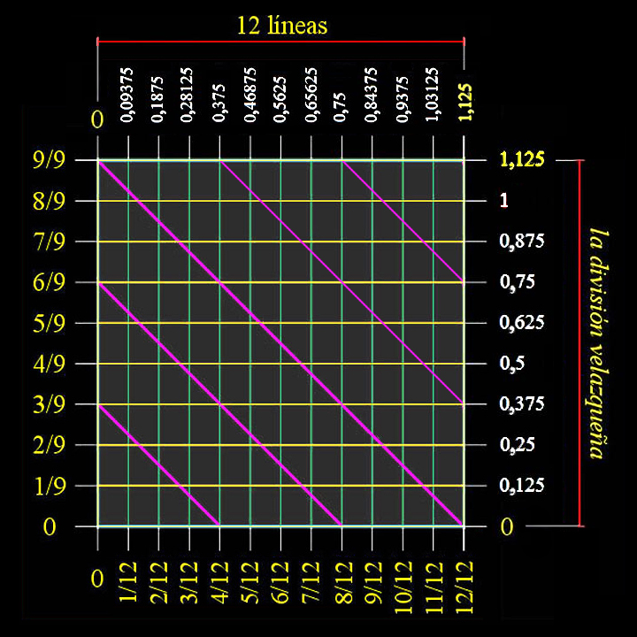 La pulgada fraccionada en nueve partes, que hemos denominado la división velazqueña, está en relación directa con cada una de las 12 partes, ó 12 líneas, en las que se divide la pulgada castellana: