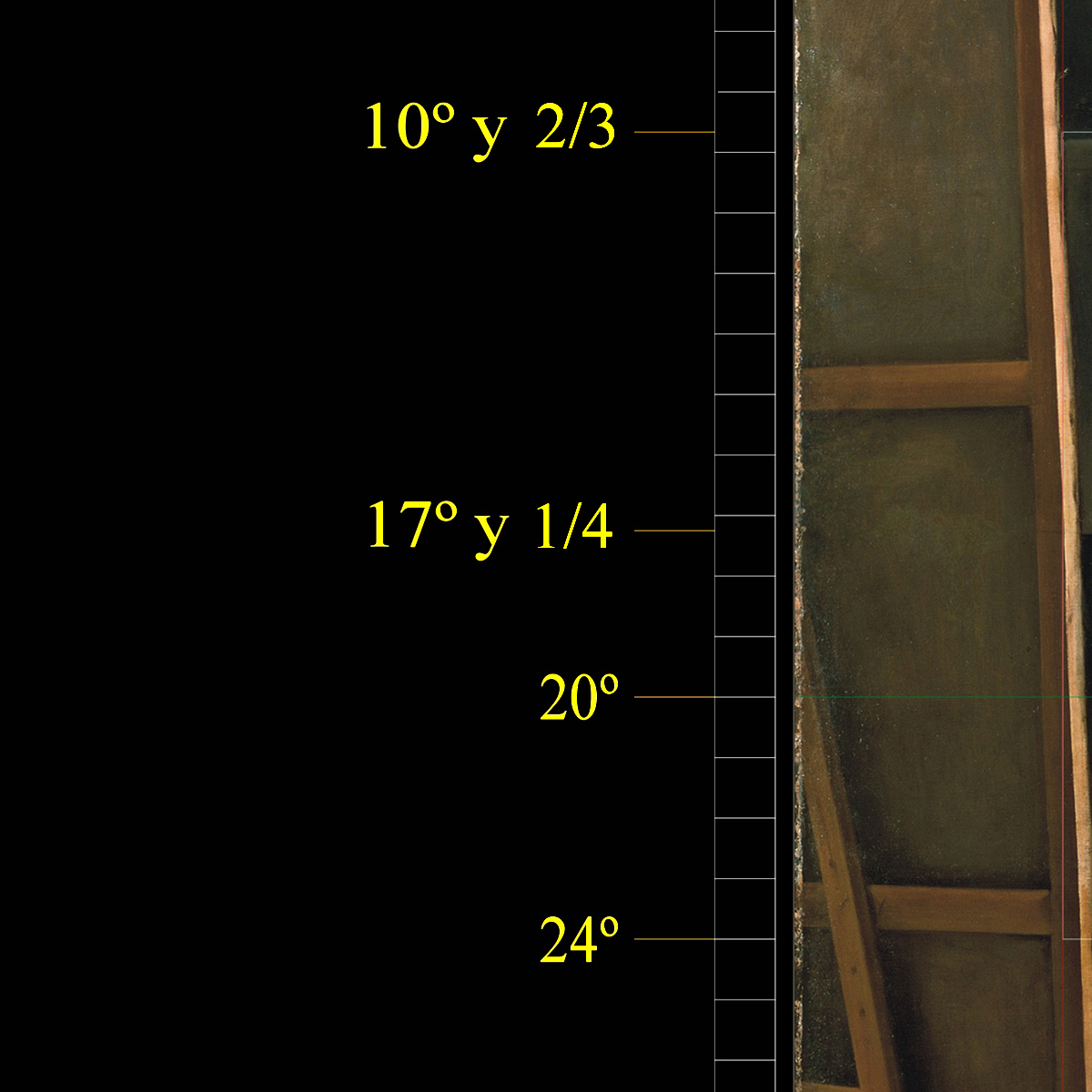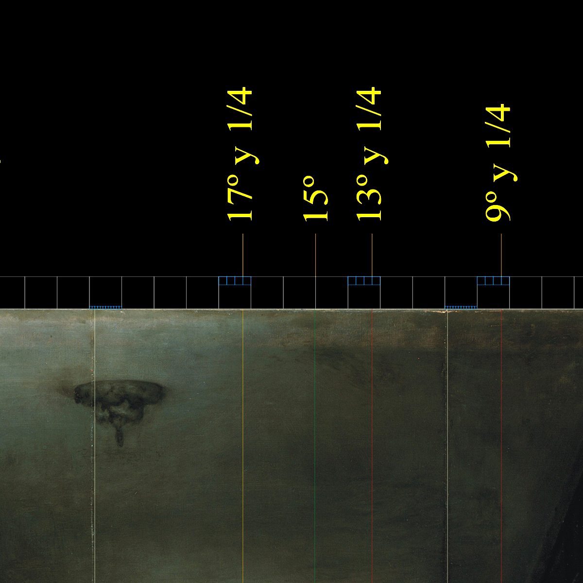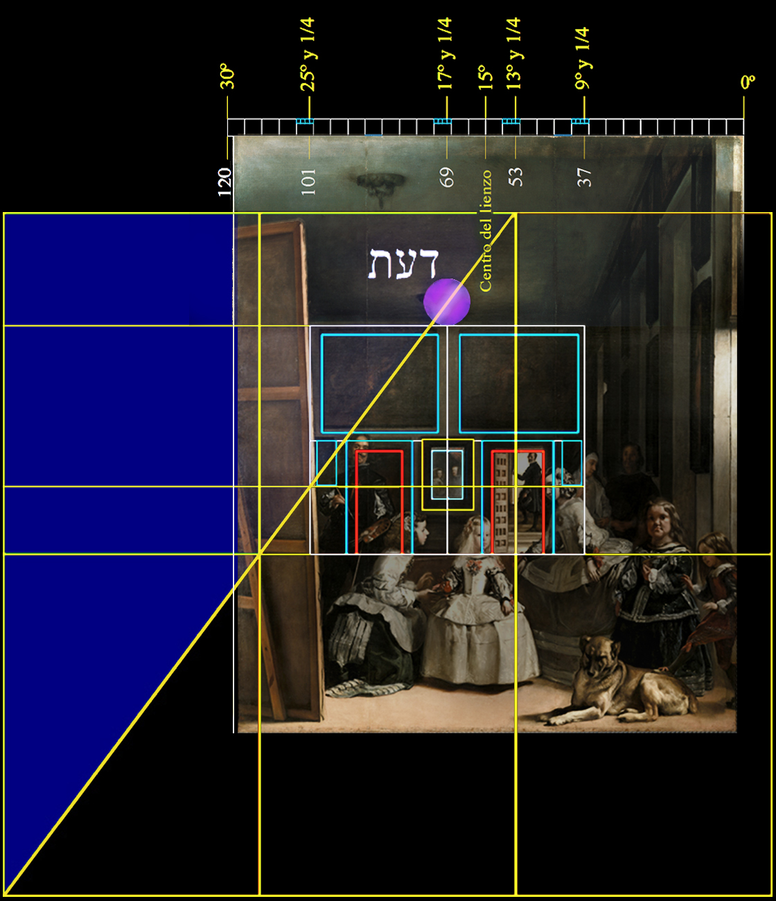 En este análisis se deduce que la altura del lienzo original de Las Meninas medía el doble del ancho de la distancia entre el centro del espejo y el borde del orillo del lino original en el canto derecho del moderno bastidor.