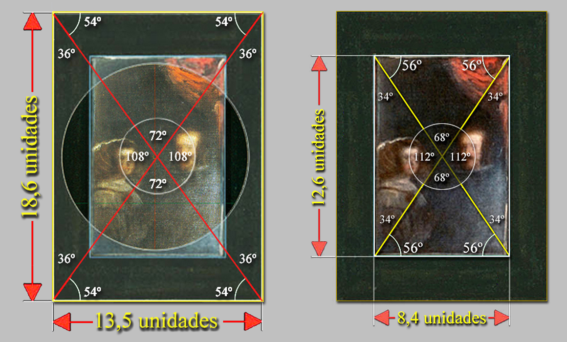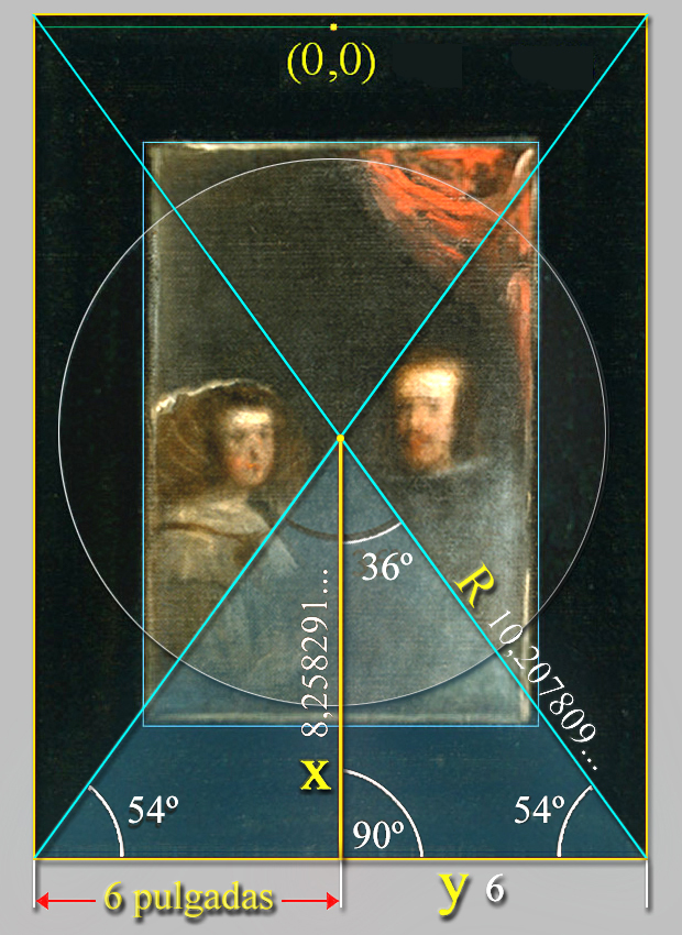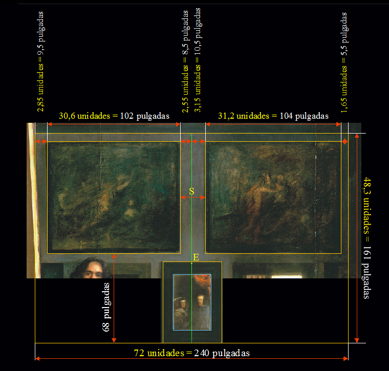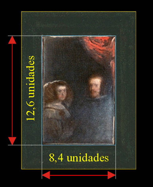 En esta ilustración se comprueba que esta pintura fue concebida a partir de un perfecto cuadrado; y como se puede observar se deduce que la altura del lienzo original de Las Meninas medía el doble del ancho de la distancia entre el centro del espejo y el borde del orillo del lino original en el canto derecho del moderno bastidor.