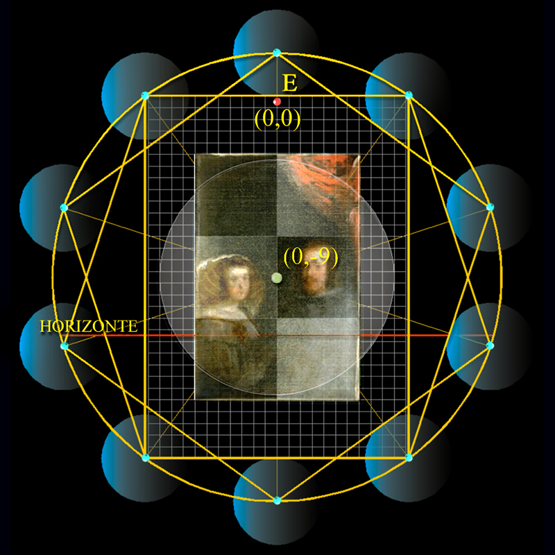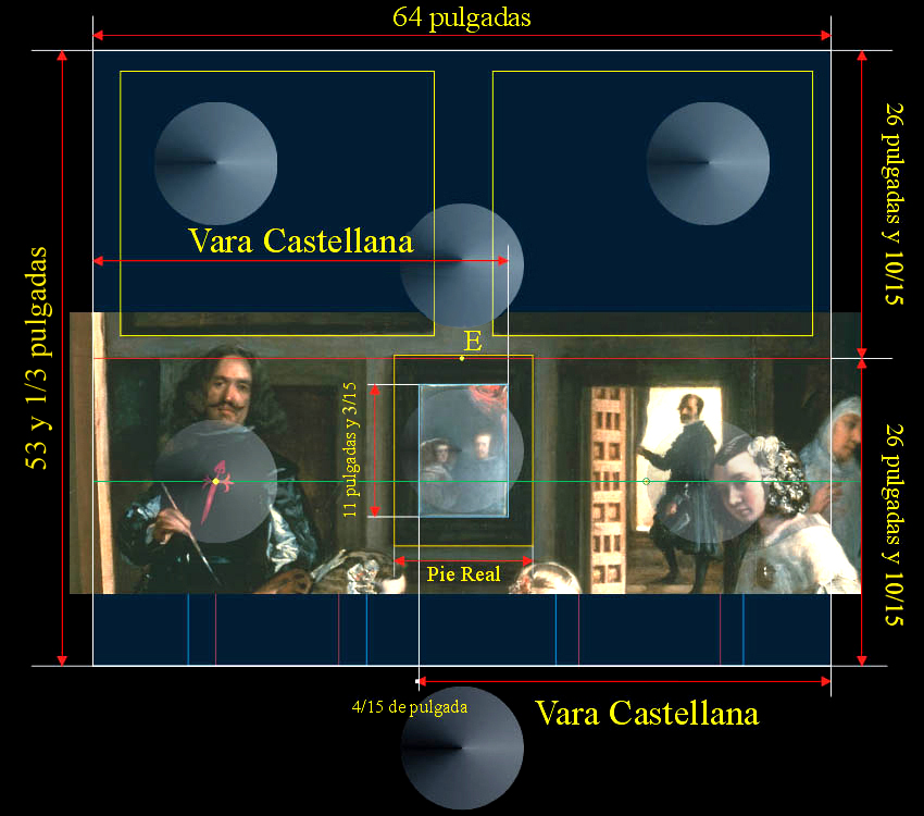 Las cuadrículas de trabajo sobre la superficie de Las Meninas se subordinan al sistema de medidas castellanas y a coordenadas cartesianas, y se sustentan, pues, como centro de este plano, en el punto E situado en la parte superior del espejo.
