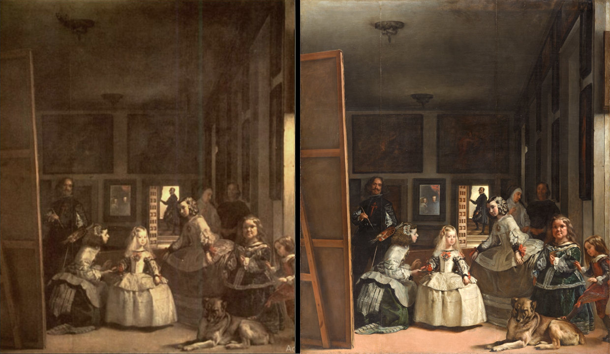 El día 14 de mayo se inició, por mano de John Brealey, Director del Departamento de Conservación de Pinturas del Museo Metropolitano de Nueva York, la limpieza de Las Meninas, gracias a la generosa ayuda de Mrs. Hilly Mendelssohn, que había donado al Museo del Prado una importante suma de dinero para que fuese aplicada a la restauración de alguna obra significativa. |