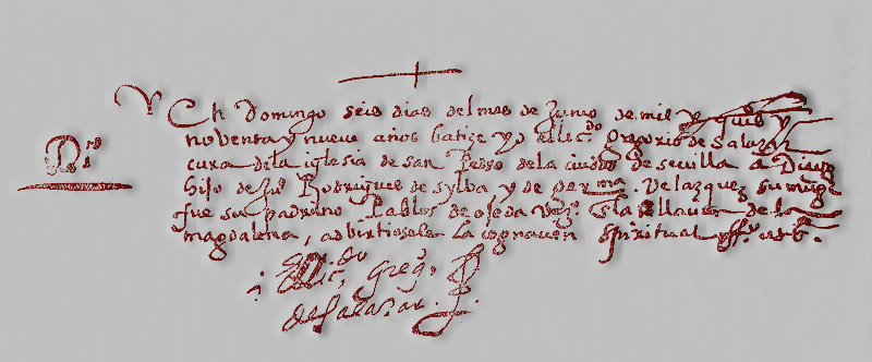 En Domingo seis días del mes de Junio de mil y quinientos y noventa y nueve años batize yo el licenciado Gregorio de Salazar cura de la iglesia de San Pedro de la ciudad de Sevilla a Diego hijo de Juan Rodrigues de Sylva y de Geronima Velazquez su muger. Fue su padrino Pablos de Ojeda vezino en la collacion de la Magdalena, advirtiosele la cognición espiritual.