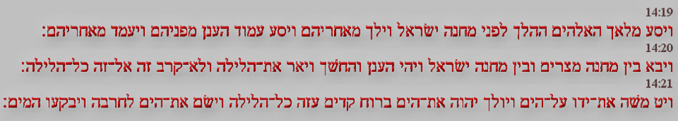 Y el ángel de Dios que iba delante del campamento de Israel, se apartó, e iba en pos de ellos; y asimismo la columna de nube que iba delante de ellos, se apartó, y se puso a sus espaldas. E iba entre el campamento de los egipcios y el campamento de Israel; y era nube y tinieblas para aquellos, y alumbraba la noche a Israel; y en toda aquella noche nunca llegaron los unos a los otros. Y extendió Moisés su mano sobre el mar, e hizo el Señor que el mar se retirase por recio viento oriental toda aquella noche; y tornó el mar en seco, y las aguas quedaron divididas. |