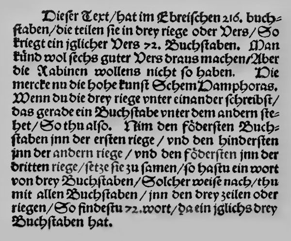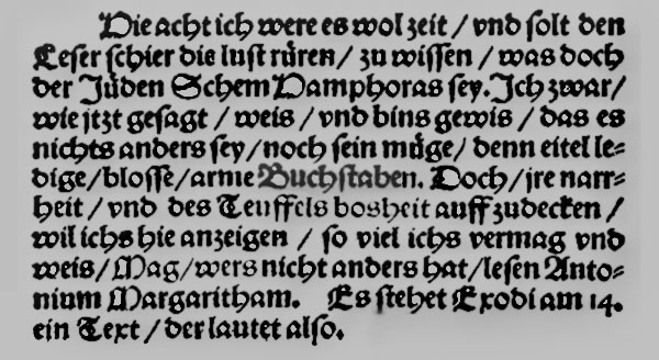 Aquí supongo que será el momento de tratar lo que el lector desea saber acerca del Schem Hamphoras Judío. Sé, sin embargo, como acabo de decir, y estoy seguro de que no es más que meras, simples, pobres letras. Sin embargo, para exponer su insensatez y maldad diabólica, voy a mostrar aquí tanto como pueda del mismo. Quien no lo haya hecho todavía, léase Antonium Margaritham. Está escrito en Éxodo 14. en un texto que así reza. |