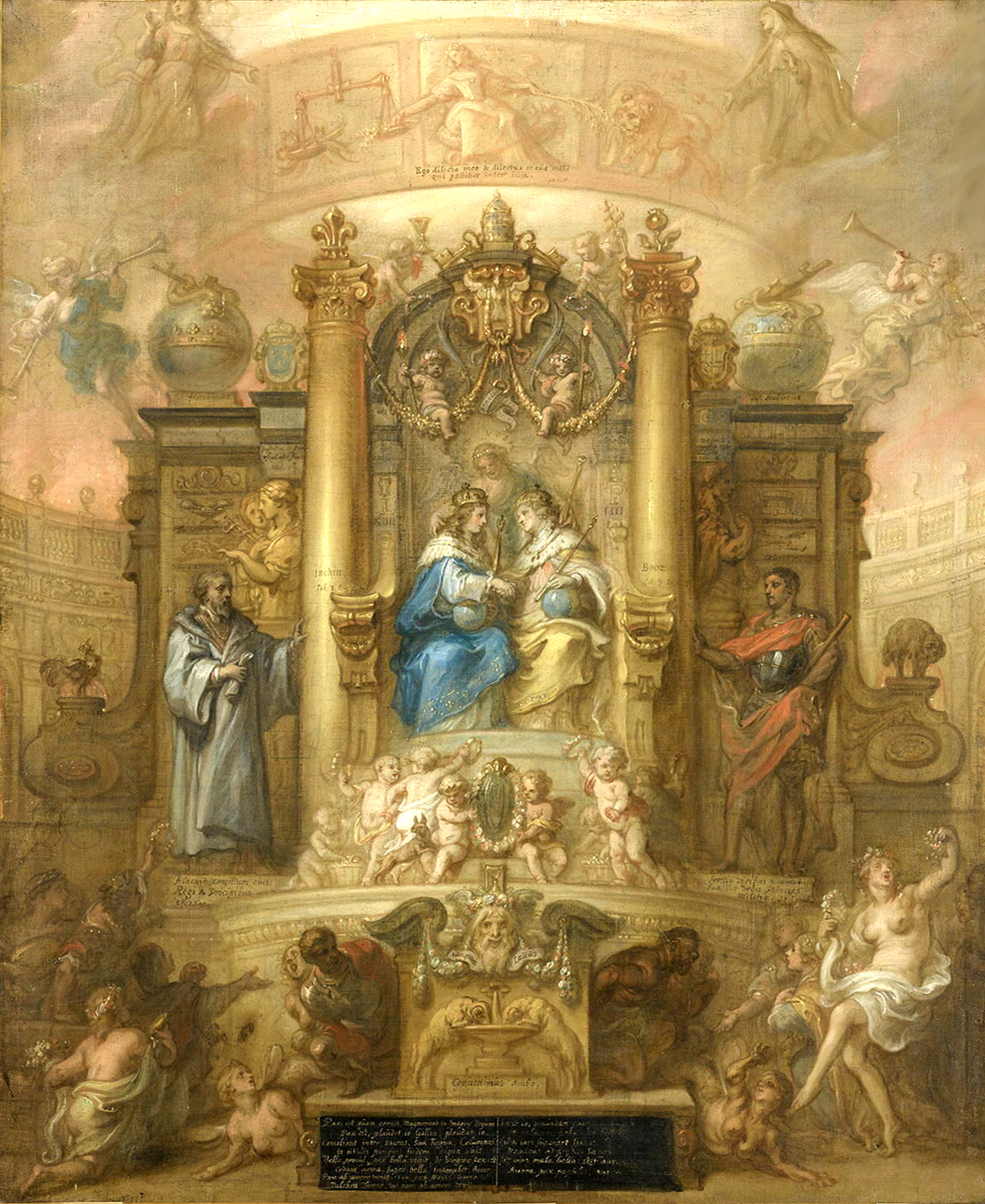 El Lunes por la mañana, que fue a tres de Otubre, dia triſtiſsimo para Eſpaña, pues en el ſe le puſo eſte Sol de virtudes por el Ocaſo de ſu muerte: eſtuuimos a la cabecera de la cama de la Reyna N.S. el padre Ricardo Haller ſu confeſſor, el padre Antonio ſu compañero, el padre F. Franciſco de Arribas confeſſor de la ſeñora Infanta doña Ana: el Dotor Gamarra, Cura de Palacio: el padre Prior de S. Lorenço, y yo, rezando y diziendo algunas deuociones, y dos vezes dixe yo la Recomendacion del alma, la qual encomendò ſu Mageſtad en las manos de ſu Criador, dando dos boqueadas ſin ninguna deſcompoſicion de ſu ſemblante, el qual quedò como de vn Angel, entre las nueue y diez de la mañana (a la miſma hora que nacio) del dia y mes que he dicho del año de mil y ſeiſcientos y onze, ſiendo de edad de veinte y ſeis años nueue meſes y ocho dias. No falta quien halle miſterio en las miſmas letras del nombre de doña Margarita de Auſtria Reyna de Eſpaña y diga que deſtas letras reducidas a numero ſale cabalmente eſte de mil y ſeiscientos y onze, que fue el año en que la Reyna nueſtra ſeñora murio. En eſpirando le diximos vn reſponſo con harto ſentimiento y dolor. Y el cielo parece acudio, y ſe conformò en el ſentimiento de todos, dando el primer clamor entre eſcuras y eſpeſſas nubes con vn gran trueno que a eſte punto ſe oyò: quiza fue eſta la ſeñal que hizo aquel hijo del trueno el Apoſtol Santiago Patron de Eſpaña, que como Reyna della la ſalio a recibir haziendola primero eſta ſalua. |
