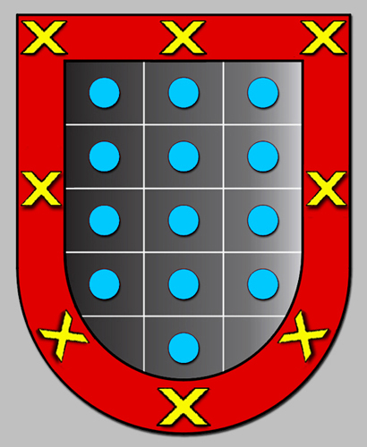 Escudo de plata con trece roeles de azur; bordura de gules con ocho aspas de oro.