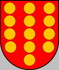En campo de gules, trece bezantes de oro colocados de tres en tres y uno de non.
