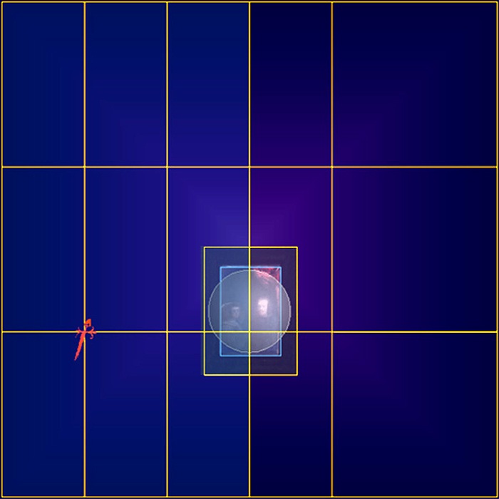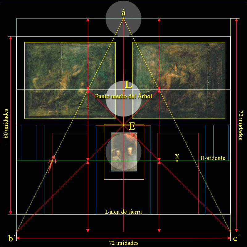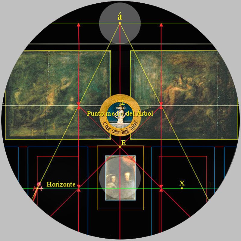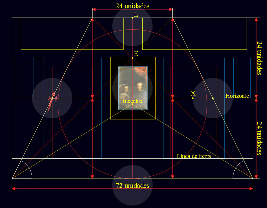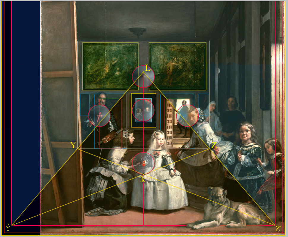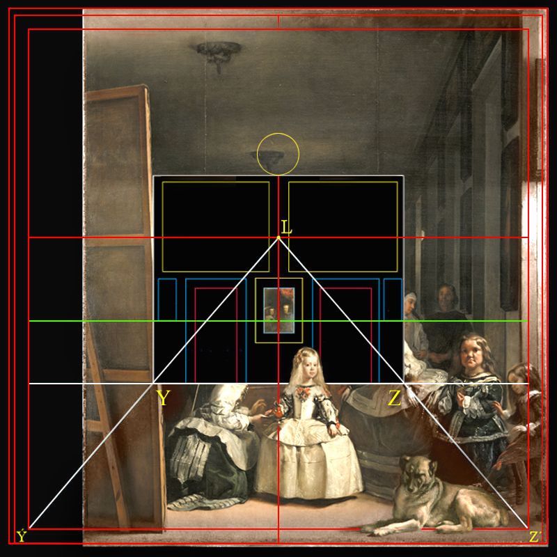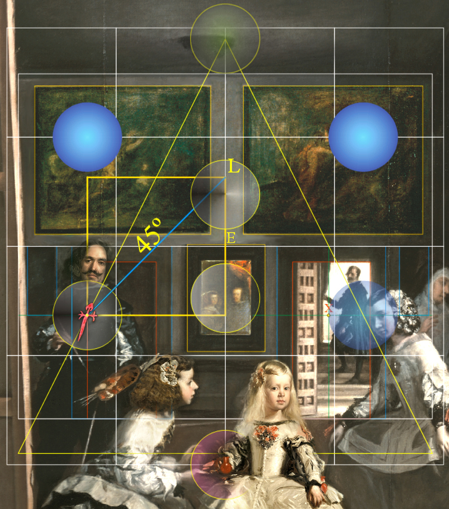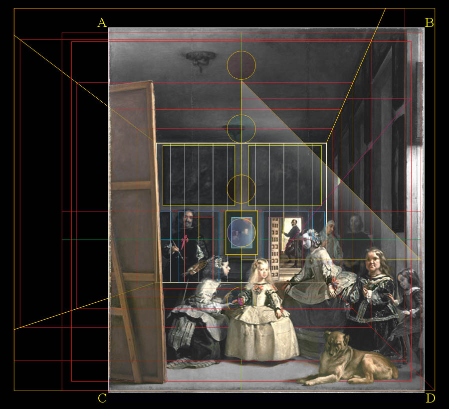 La denominada regla de los Tres Tercios divide la escena de la pared del fondo en tres partes iguales; tanto horizontal como verticalmente, y establece los centros de interés de Las Meninas.