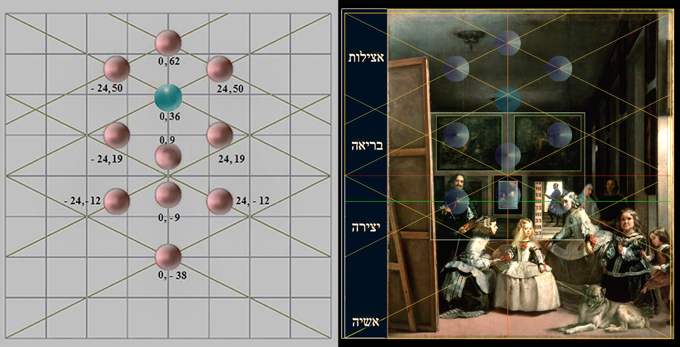 El maestro Velázquez, inmerso en su autorretrato, emplaza con exactitud el centro de la Sefira nº 8, Hod, El Honor, en la cruceta de la Cruz de Santiago, que, de acuerdo con la Kabala, es la posición designada a la esfera donde el cabalista conjura, con fe absoluta, lo que desea conseguir en el plano material.