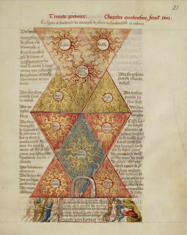 La alegoría femenina sujeta en su mano izquierda una escuadra, y con la derecha manipula un compás sobre un tablero de dibujo redondo. Enfrente de ella, un grupo de diez monjes observan, con animada atención, el estudio de la práctica geométrica. |