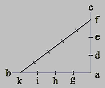 Luego toma en el otro lado, ò linea a. b. quatro tamaños ſemejantes à eſtos como denota g. h. i. k. Saca agora vna linea recta deſde el punto f. haſta el punto k. y ſi eſta linea tuuiere cinco tamaños ſemejantes a los tres que tomaſte en el lado a. c. ò a los quatro del lado a. b. la tal eſquadra ſera verdadera, y ſi ay menos, o mas tamaños de cinco eſtara falſa, como ſe prueua por la penultima del primero de Euclides. Porque ſi el angulo a. es recto, el quadrado de la linea a. f. y a. k. ha de ſer ygual al quadrado de la linea f. k. que es lado opueſto al dicho angulo recto, pues ſi el lado a. f. tiene tres tamaños, y en el a. k. tiene quatro, la ſumma de los quadrados deſtos numeros 3. y 4. es 25. Luego el otro lado f. k. es neceſſario que tenga cinco tamaños, para que ſu quadrado haga veynte y cinco, que es lo que haze la ſumma de los quadrados de los otros lados que comprehenden el angulo recto. Ha ſe dicho eſto aquí porque como con eſte inſtrumento ſe ha de moſtrar medir diſtancias, es bien ſaberle hazer. |