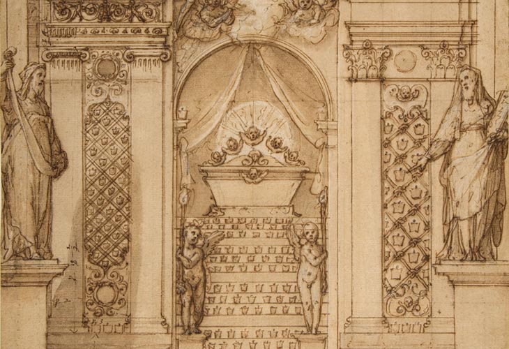 10 - La construcción de un espacio sagrado se inicia a partir de un centro; en el dibujo a pluma que mostramos de Federico Zuccaro, 1542 - 1609, en el centro geométrico se localiza una gran hostia consagrada guarnecida por unas cortinas, y, justo delante, se distingue el sarcófago del Mesías, en este caso de Jesucristo, y que, a su vez, se haya flanqueado por las alegorías de Moisés, a la derecha, y la de Elías, a la izquierda.