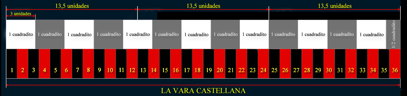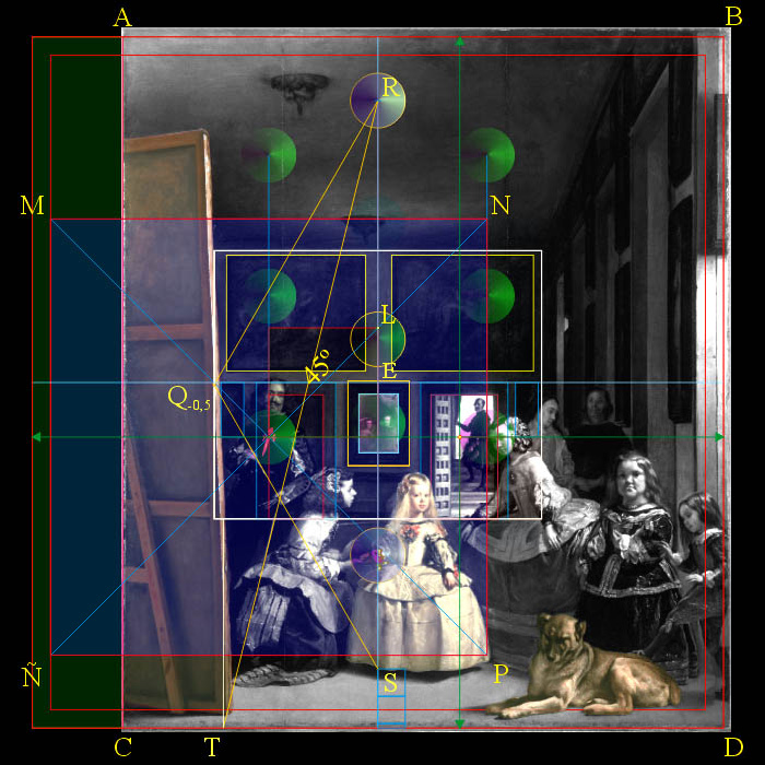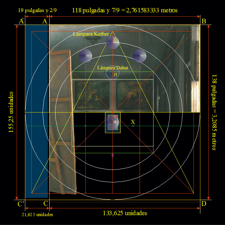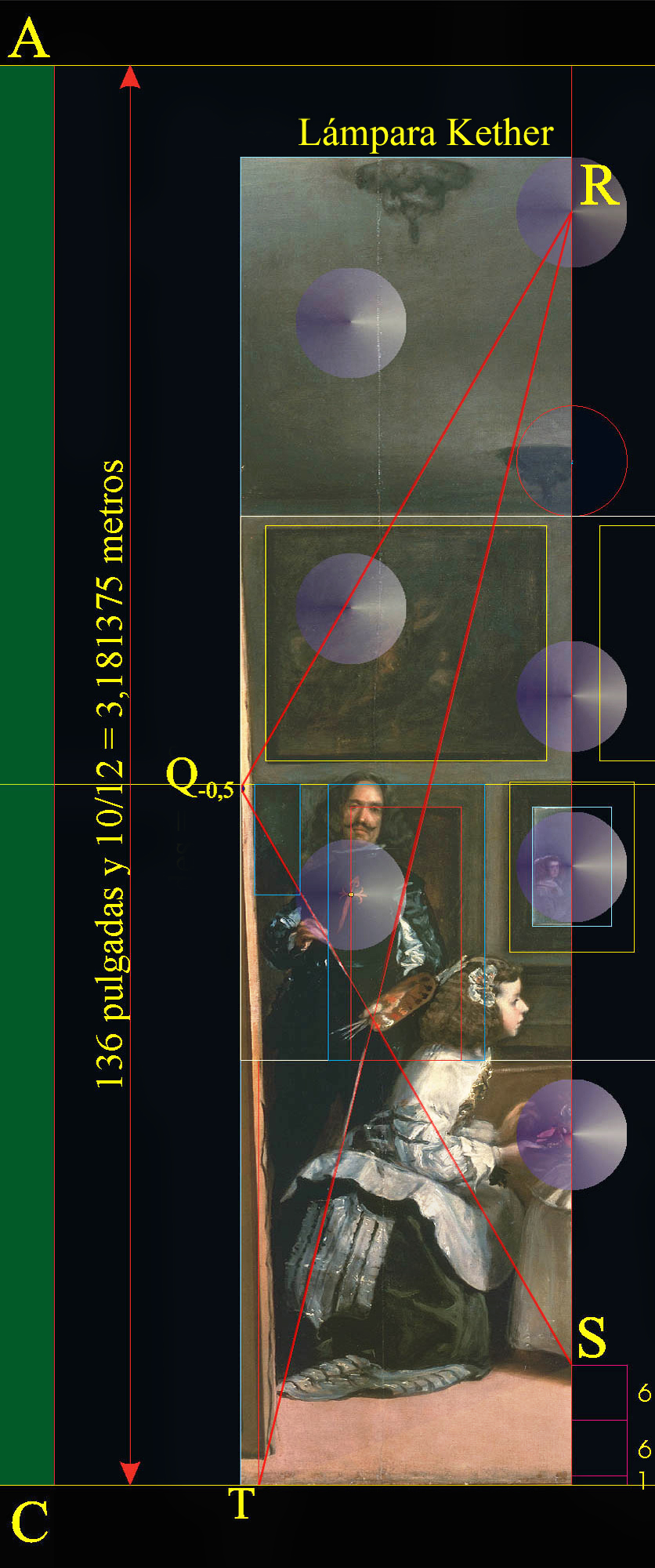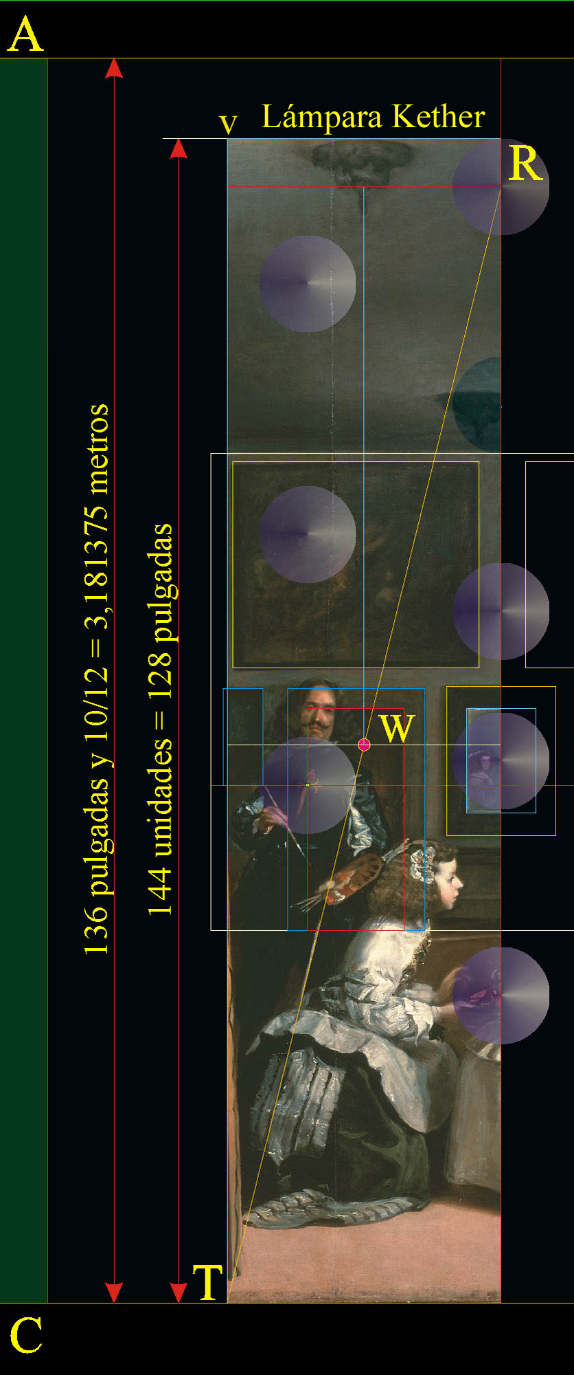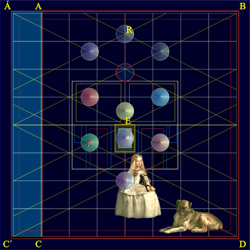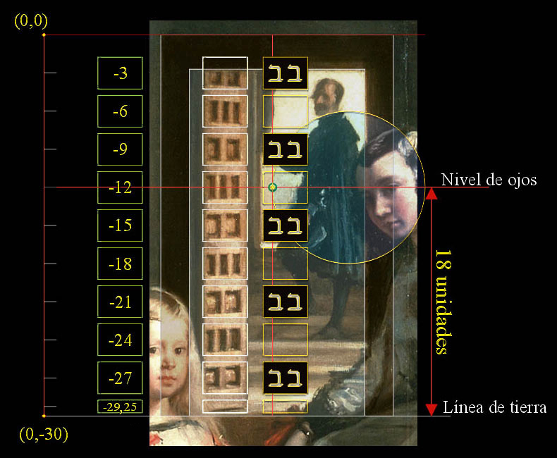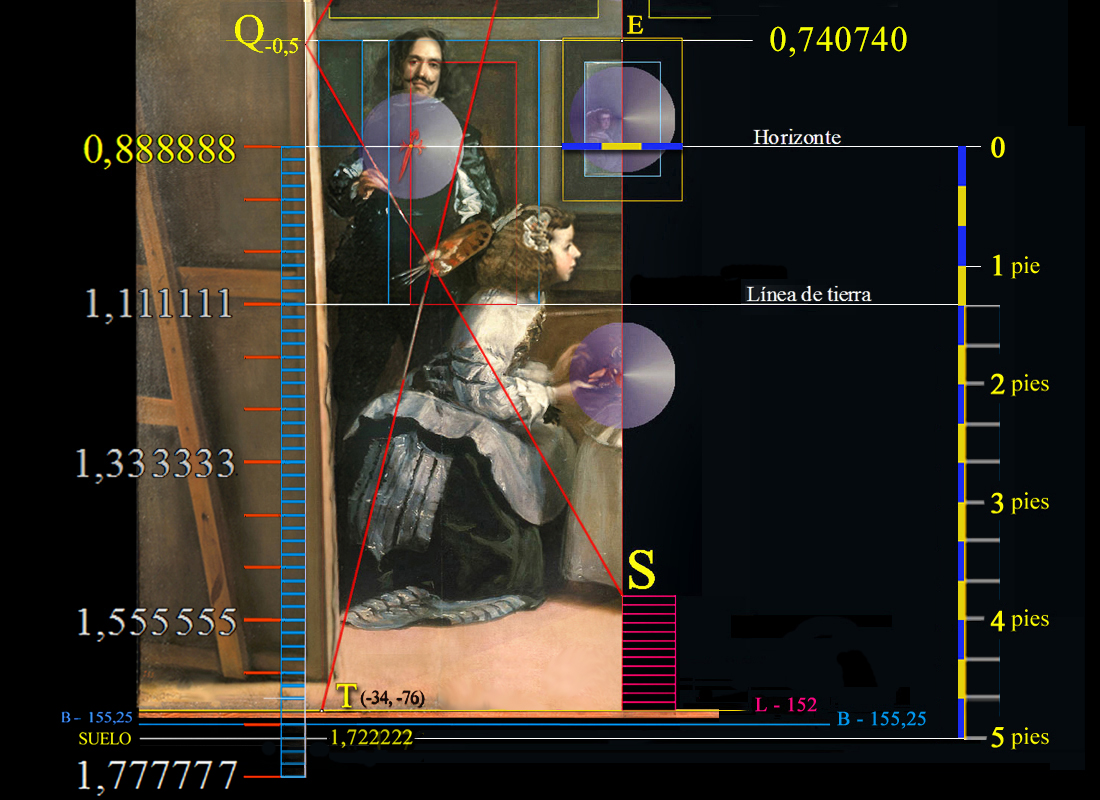 Este patrón de medidas longitudinales trata del antiguo sistema de medición castellano, que mide y acota, apropiadamente, todo el área y perímetro de Las Meninas, y se aviene con la Geometría descriptiva al 100 %: