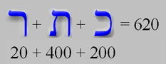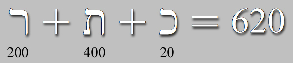 Ahora bien, las tres consonantes que componen la palabra Kether suman 620; número que representa, pues, el total de los mandamientos que Dios ordenó al pueblo de Israel, que, a su vez, supone, además, el mismo número de letras que componen los versículos donde se mencionan los Diez Mandamientos en el capítulo 20 del Éxodo; desde el versículo 3 hasta el versículo 17 inclusive.