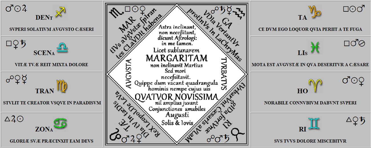 Y de 1673 encontramos, pues, en el libro de Joannes Franciscus Christopherus a la muerte de la emperatriz Margarita, un anagrama en su horóscopo elaborado con las mismas letras del nombre de MARGARITA cuya letra T corresponde al signo de Leo.
