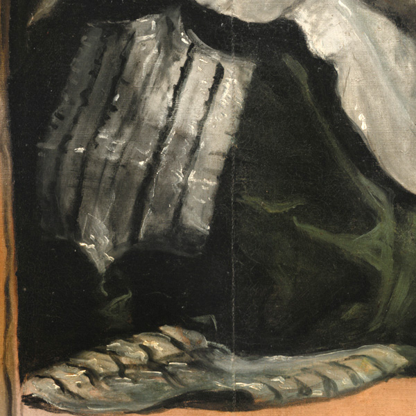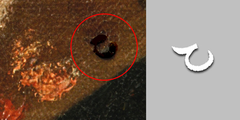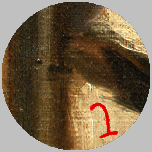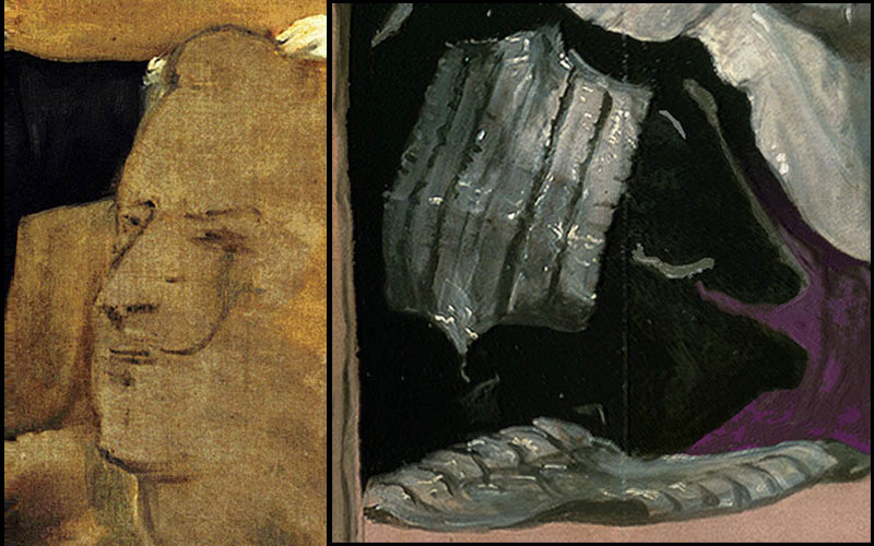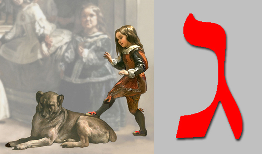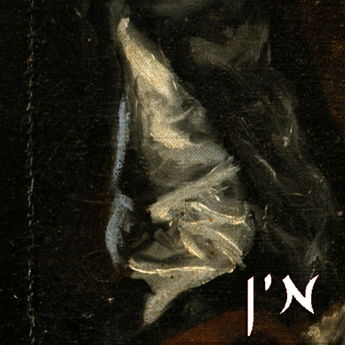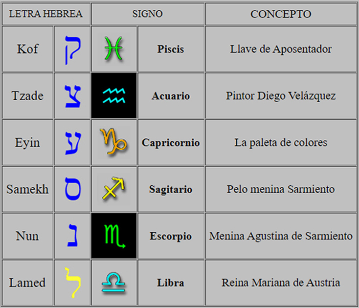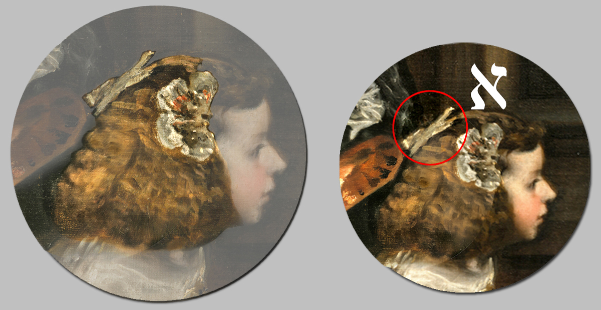 Para respaldar este criterio ampliaremos los límites visuales de Las Meninas observando ciertas pinceladas, en el hombro izquierdo del pintor, elaboradas con caligrafía hebrea, en definitiva, un tipo de pincelada que el ojo discierne, pero que cumplen un efecto apotropaico para alejar el mal o protegerse de lo desconocido.
