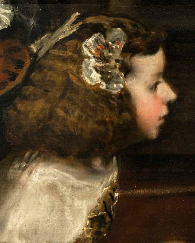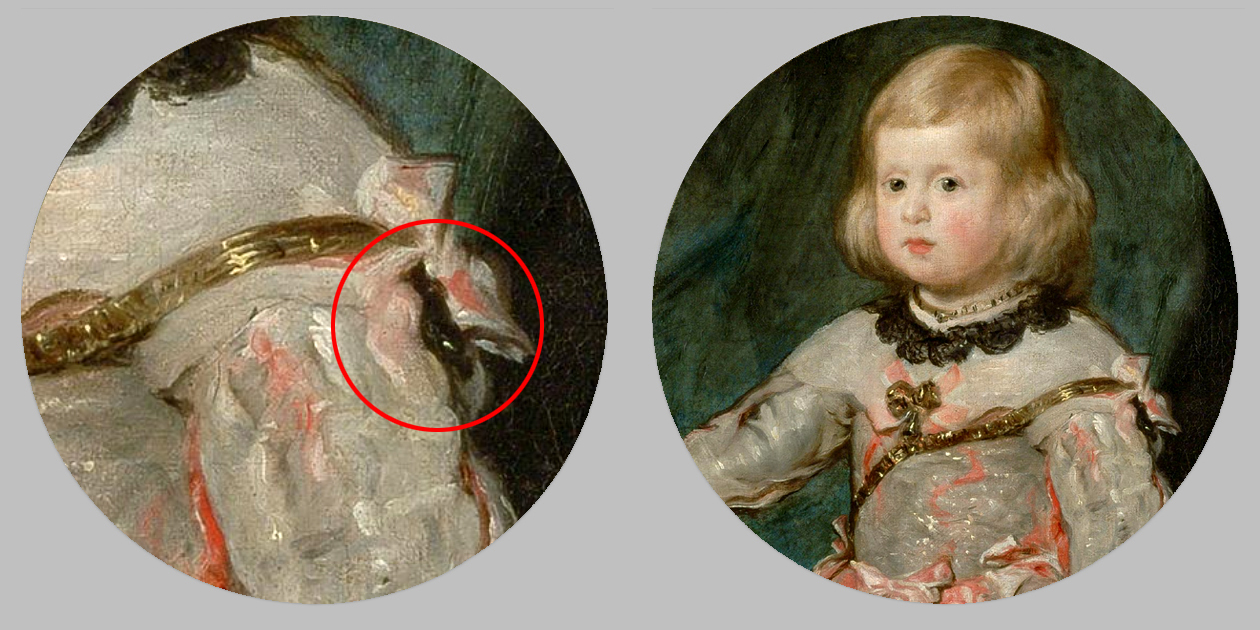 Habría que añadir, pues, un algo más acerca de esta letra hebrea Eyin esbozada en el hombro izquierdo del pintor, ya que se conservan varios retratos pintados por Velázquez de los hijos del rey; de la Infanta Margarita, y del heredero Felipe Próspero, con higas de azabache en forma de puño prendidas en sus sendos hombros izquierdo para ahuyentar el mal de ojo; en definitiva, un amuleto que también se ha utilizado contra la envidia, los celos, y como protector de enfermedades.