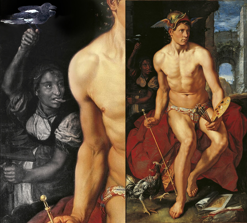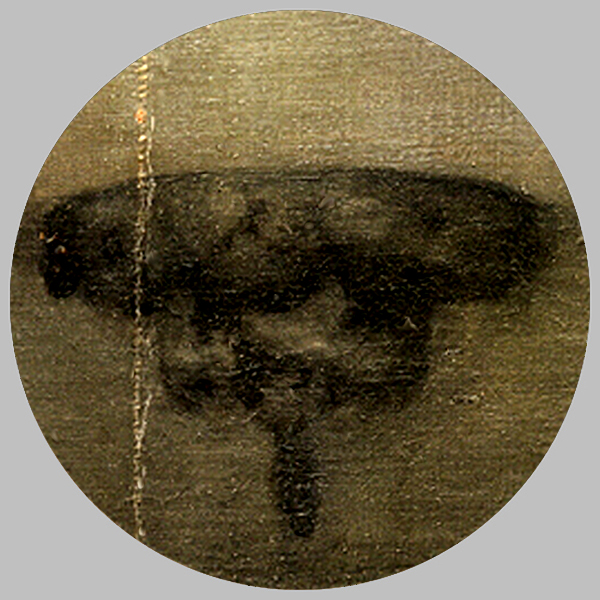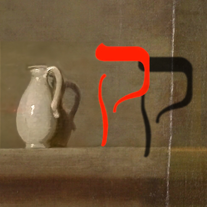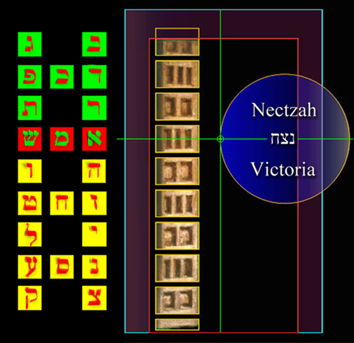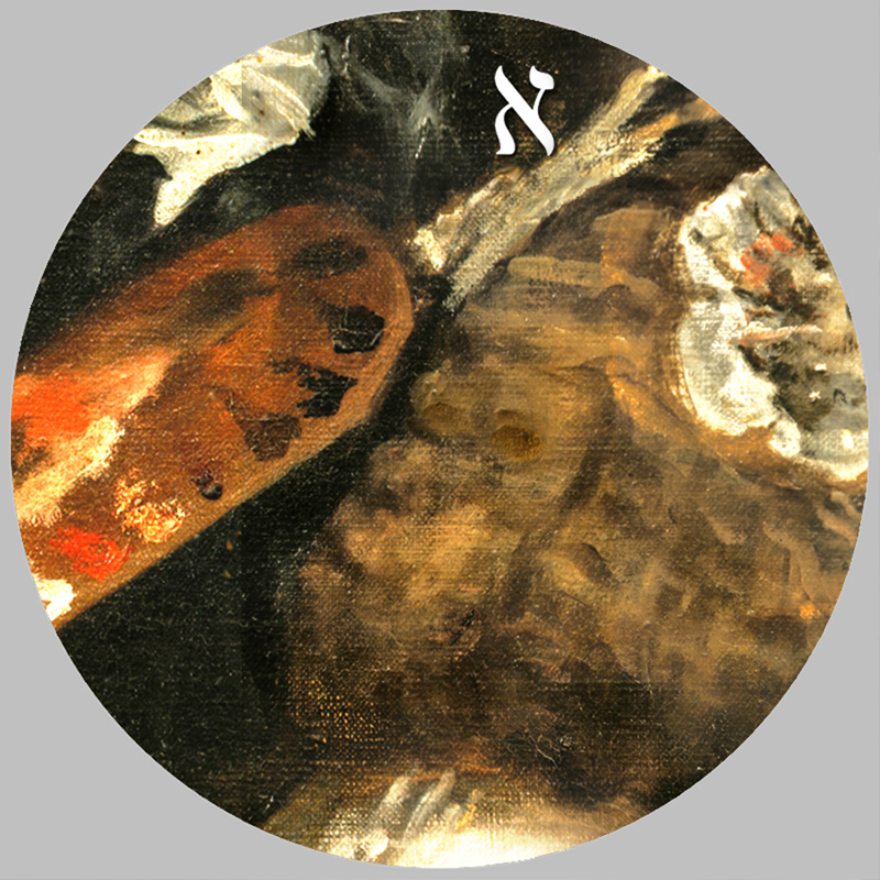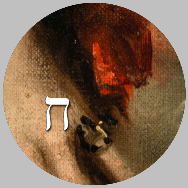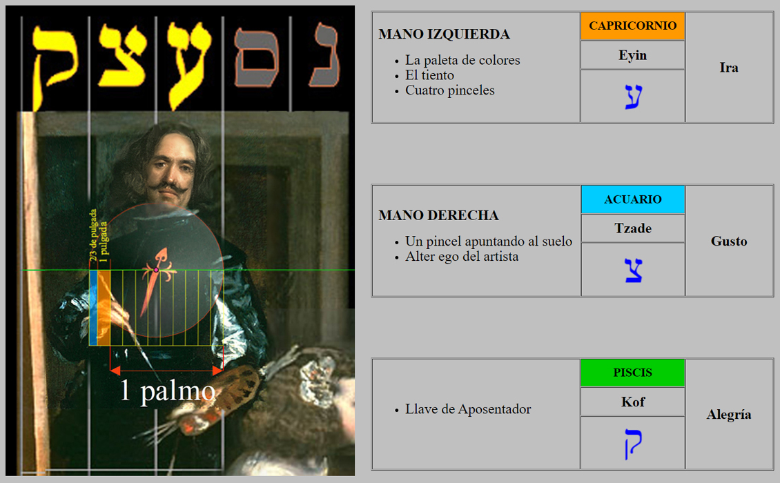 La letra hebrea Eyin en el hombro izquierdo del pintor se sitúa en la marca solsticial de Invierno, bajo el eje de la Lámpara Kether.