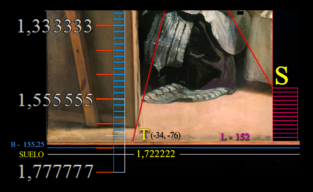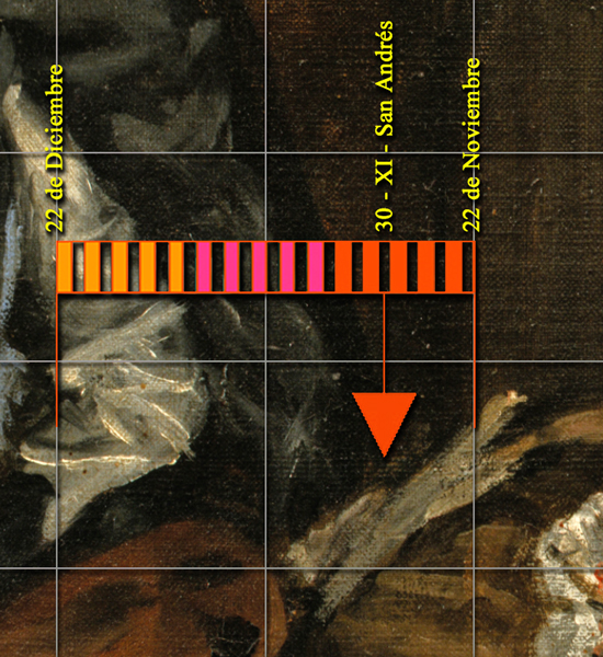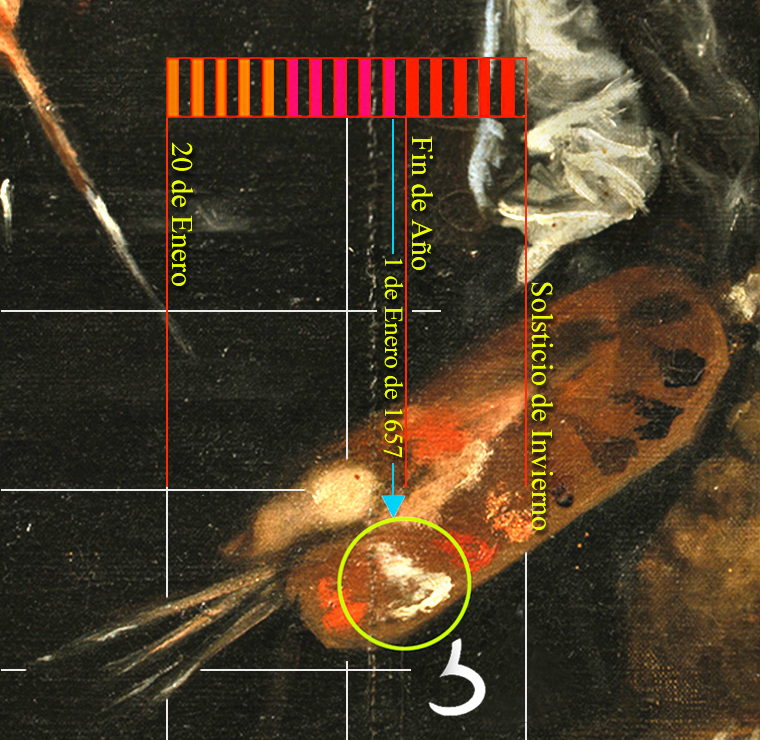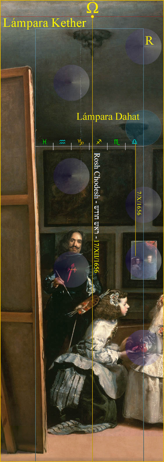 Advertimos, pues, que en la pared del fondo de Las Meninas ha quedado preservado un Calendario perpetuo, de manera, que en la perpendicular que cruza por el punto medio de la Lámpara Kether se halla la marca del 17 de Diciembre de 1656.