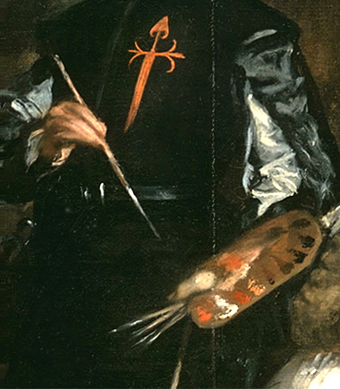 En la imagen en estudio observamos el autorretrato del pintor sujetando un pincel en su mano derecha, mientras que en su izquierda sostiene; el tiento, cuatro pinceles y, en la paleta de madera, distintas muestras de colores de su cumplido trabajo, y, sin embargo, en este área aún hay más de una sorpresa preparada; ya que Velázquez, al situar sobre su pecho a la cruceta de la Cruz del Hábito de Santiago como centro de la Sefira nº 8, Hod, que representa el Honor, propone, sin reservas, un escenario muy diferente al que se contempla.
