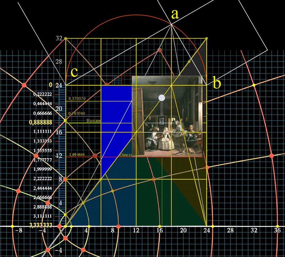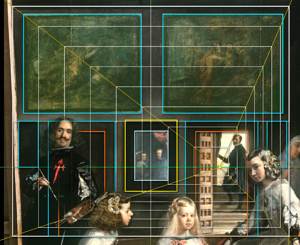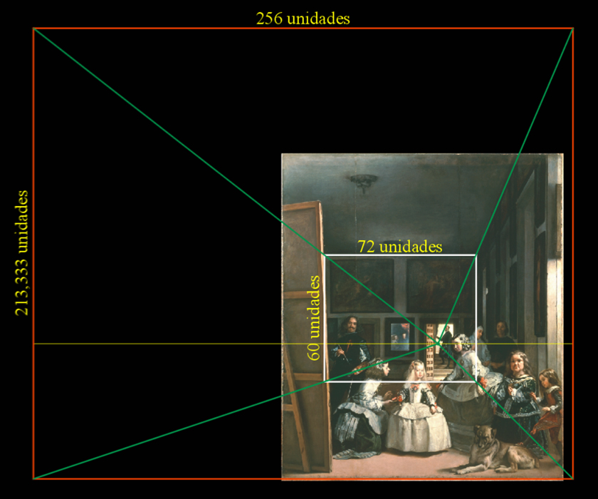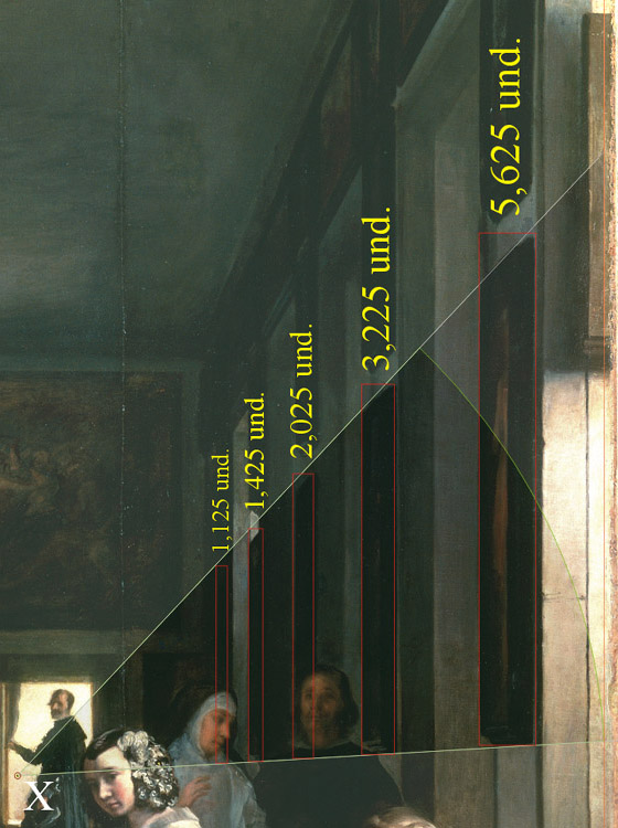 38 - El ancho del lienzo de Las Meninas equivale a la mitad de la anchura de la Habitación del Príncipe, y la escala de la distante pared pintada corresponde a 1/3,75 de esta misma sala.