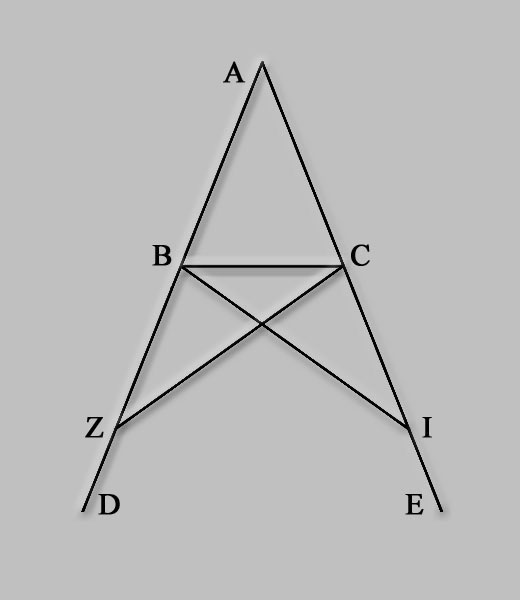 Sea el triangulo yſoſceles .ABC. que tenga el lado .AB. ygual al lado .AC. y eſtiendanſe derechamente (por la ſecunda peticion) las lineas .BD. .CE. a las lineas .AB. .AC. digo que el angulo .ABC. es ygual al ACB. y el angulo .CBD. al angulo .BCE. Tomeſe en la linea .BD. vn punto a caſo y ſea .Z. y corteſe de la linea .AE. mayor (por la tercera propoſicion) vna ygual a la .AZ. menor y ſea .AI. y juntenſe .ZC. y .IB. y porque .AZ. a la .AI. y .AB. a la .AC. ſon yguales, luego las dos .ZA. .AC. ſon yguales a las dos .IA. .AB. la vſna a la otra, y cierran el angulo comun que es contenido debajo de .ZAI. luego la baſis .ZC. es (por la .4. propoſicion) ygual a la baſis .IB. y el triangulo .AZC. ſera ygual al triangulo .AIB. y los demas angulos a los demas angulos el vno al otro ſeran yguales, debajo de los quales ſe eſtienden yguales lados, eſto es el angulo .ACZ. al angulo .ABI. y el angulo AZC. al angulo AIB. y porque toda la .AZ es ygual a toda la .AI de las quales la linea .AB. es ygual a la linea .AC luego la que reſta .BZ. es ygual (por la .3. comun ſentencia) a la .CI. que reſta. Y eſta demoſtrado que .ZC es ygual a la misma .BI. luego las dos .BZ. ZC. ſon yguales a las dos .CI .IB. la vna a la otra, y el angulo .BZC. es ygual al angulo .CIB. (por la .4. propoſicion) y la .BC. es baſis comun, luego el triangulo .BZC. ſera ygual al triangulo .CIB. y los demas angulos a los demas angulos el vno al otro ſeran tambien yguales debaxo de los quales ſe eſtienden yguales lados (por la misma) luego el angulo .ZBC. es ygual al angulo .ICB. y el angulo .BCZ. al angulo .CBI. ſon yguales. Pues porque todo el angulo .ABI. como eſta demoſtrado es ygual a todo el angulo .ACZ. de los quales .CBI. es ygual al angulo .BCZ luego el angulo .ABC. que reſta es ygual (por la .3. comun ſentencia) al angulo reſtante .ACB. y ſon ſobre la baſis del triangulo .ABC. pero eſta demoſtrado, que el angulo .ZBC. es ygual al angulo .ICB. y eſta debaxo de la baſis. Luego de los triangulos yſoſceles los angulos que eſtan ſobre la baſis ſon yguales entre ſi, y eſtentidas las lineas rectas yguales ſeran tambien yguales entre ſi los angulos que eſtan debaxo de la baſis lo qual ſe auia de demoſtrar. |