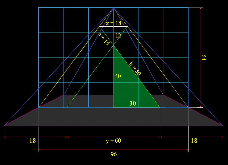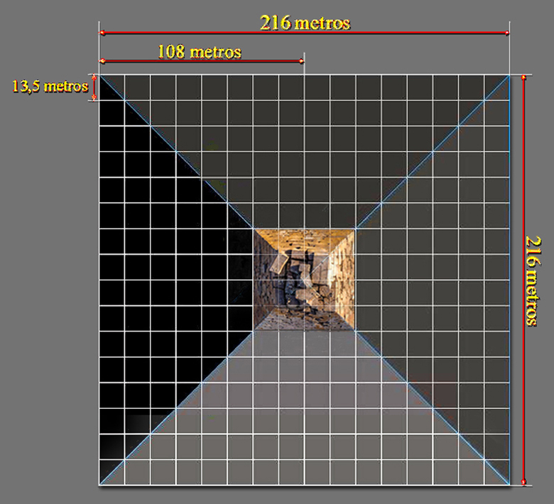 Los 216 metros de la base de la Pirámide de Kefrén equivalen, pues, a 16 bloques de piedra de 13,5 metros de lado cada uno.