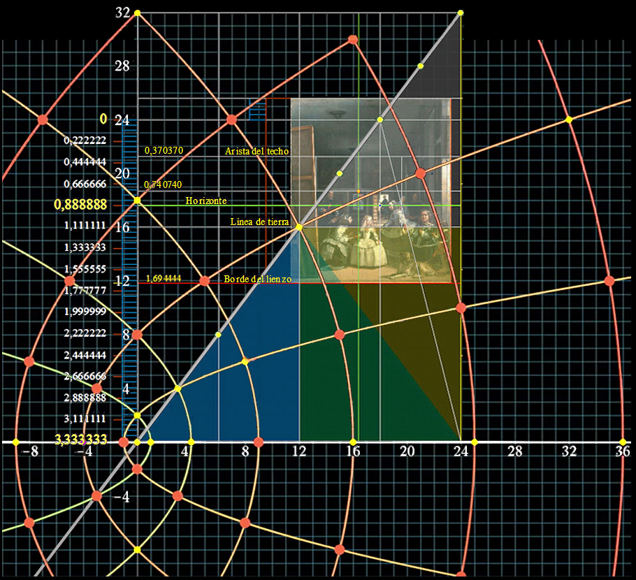 El encuadre arquitectónico de Las Meninas, identificado en nuestra ya publicada investigación, fue recreado con absoluta precisión, y por ello, e indudablemente, con la ayuda de algún tipo de ingenio mecánico. De acuerdo con ello, como nosotros creemos ( y la prueba absoluta probablemente requeriría raspar el cuadro hasta la preparación ) , Velázquez debió de cubrir primeramente el lienzo con un sistema lineal o de rejilla ( probablemente impuesto sobre la superficie con finas líneas de carboncillo ) y casi con seguridad con retículas individuales de ½ o un pie para cada subcuadrado ( 1 pie = 1/3 de vara = 0,278 metros ) . Esta retícula correspondería a la plantilla de la pantalla cuadriculada de tamaño reducido, que utilizaban tradicionalmente los pintores, el marco de perspectiva, esto es, “el velo” descrito primeramente por León Battista Alberti ( en su Della Pintura, libro que estaba en la biblioteca de Velázquez ) . Dados algunos precedentes históricos y físicos, casi con seguridad esta retícula pudo ser grabada en la placa visual de una cámara oscura.