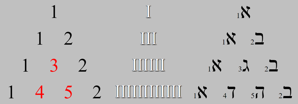La siguiente triangulación del número 22 alude, también, a las 22 letras hebreas, cada cifra es la suma de las dos que están situadas por encima de ella.