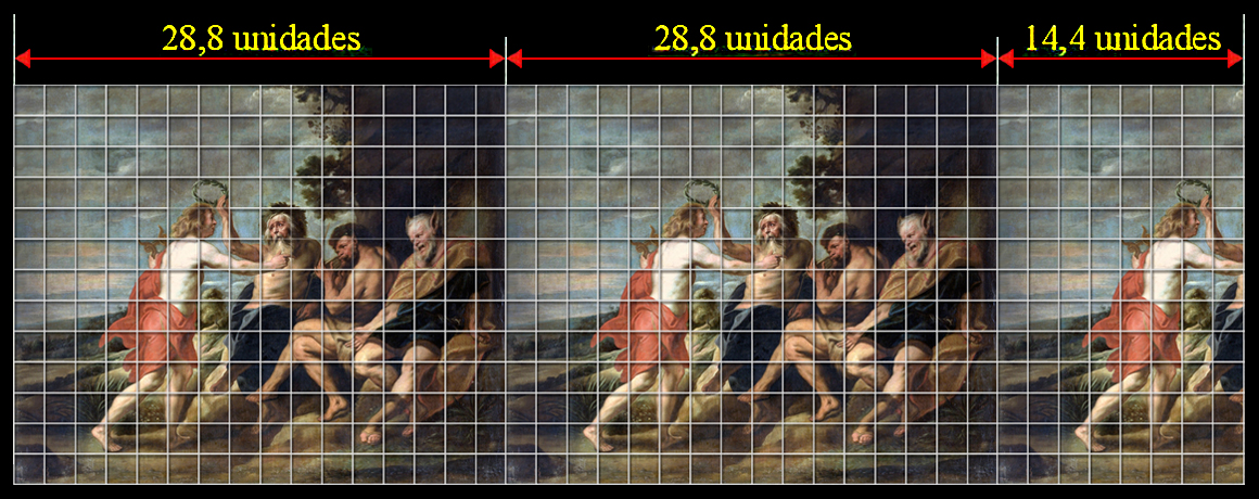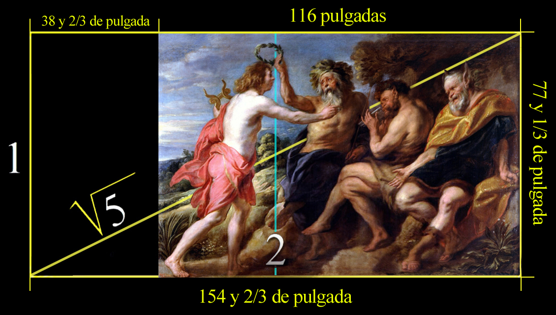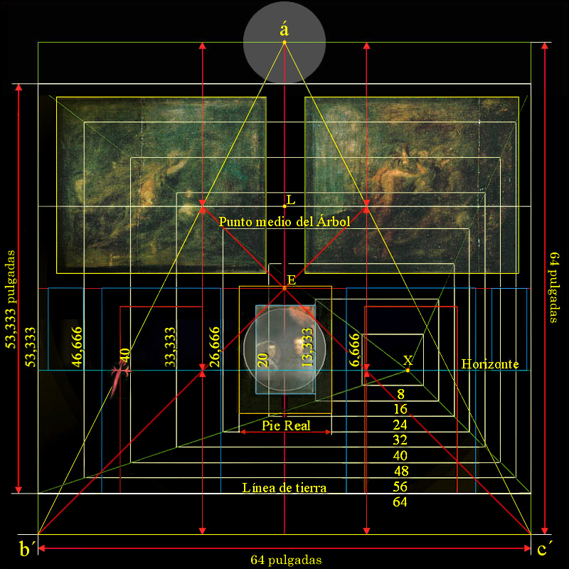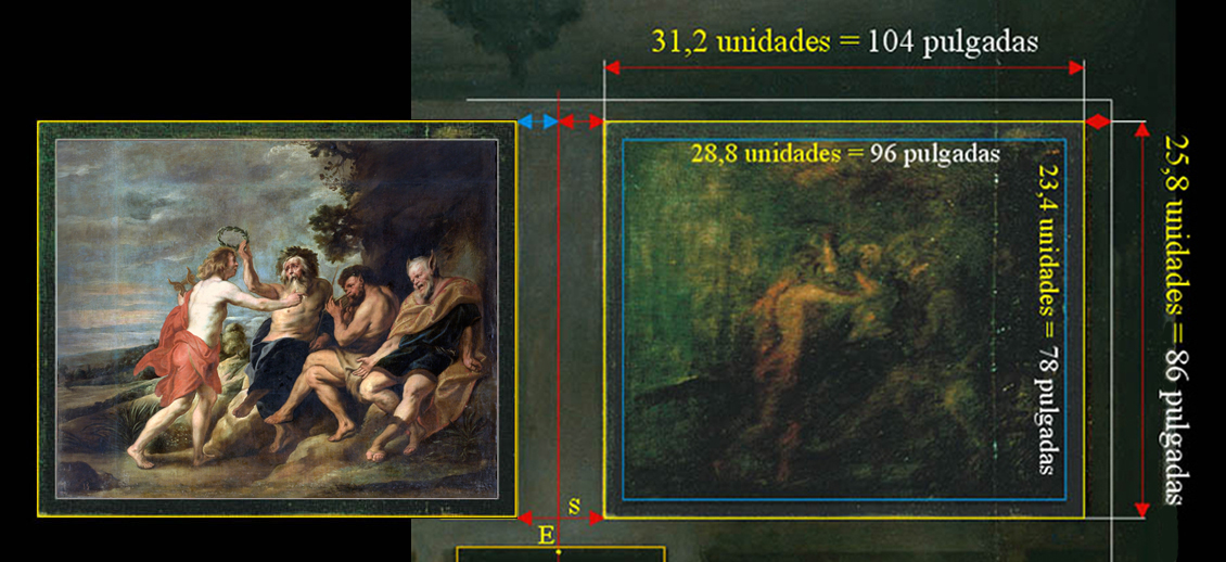 Esta operación matemática representa el ancho real de esta pintura: 96 pulgadas x 0,02325 metros por pulgada = 2,232 metros, es decir; 8 pies, que equivalen a 2 varas y 24 pulgadas; que corresponden a la anchura verdadera que ofrece actualmente el Catálogo del Museo del Prado.