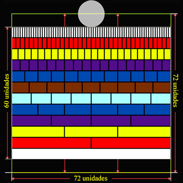 72 unidades x 3,333333... pulgadas por unidad = 240 pulgadas = 20 pies Castellanos = 5,58 metros.