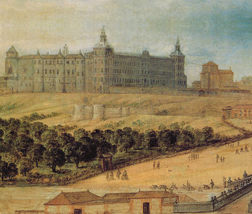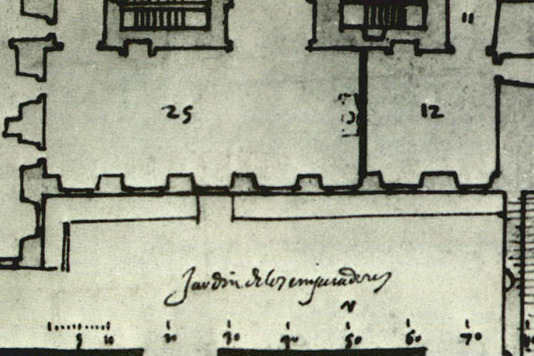 En el mismo siglo XVII este lugar del Alcázar [4], enumerado con el nº 25 en la Relación núm. 2 de la planta baja de palacio de Gómez de Mora, recibió distintos nombres, hemos recogido varios de ellos; la galería baja de mediodía, galería de la Reina y la Habitación del Príncipe [5].