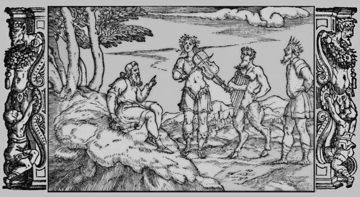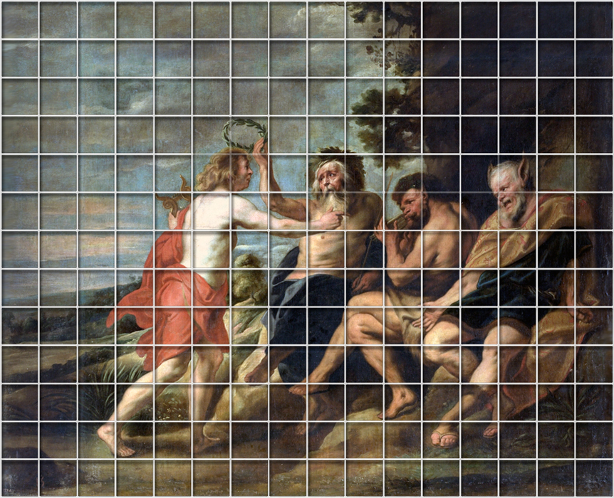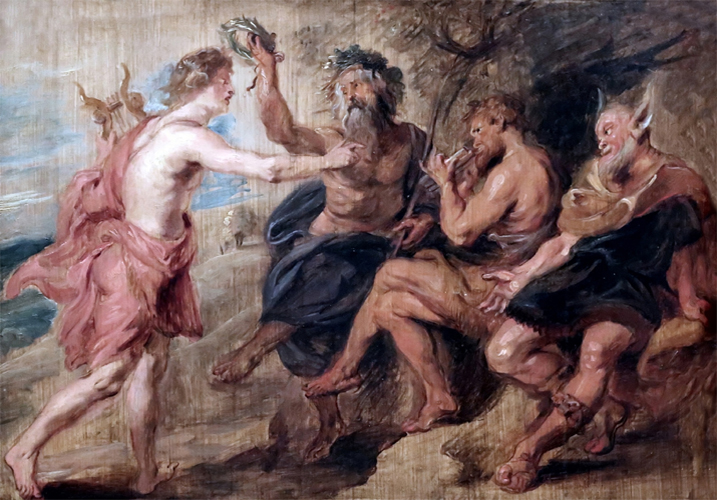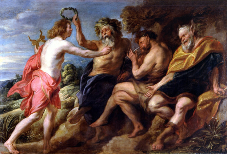 El monte Tmolo corona de laurel a Apolo, mientras que el sátiro Pan y el rey Midas esperan sentados.