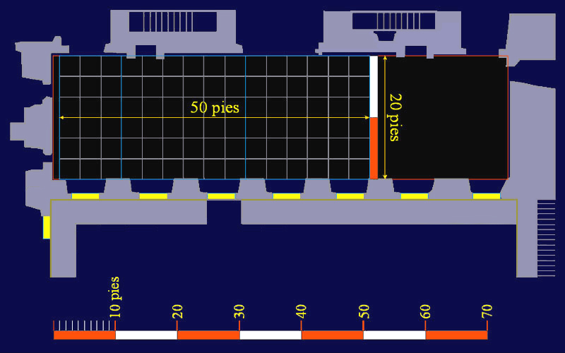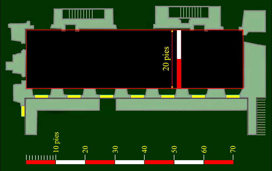 8 - Como hemos ya desarrollado, la anchura de la pared del fondo equivale a 72 unidades <=> 20 pies Castellanos = 5,58 metros.