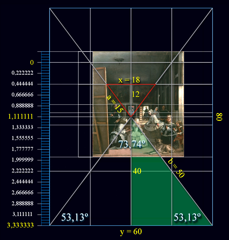 0,533333..., que es igual a 8/15, representa la escala a la que fue reducida el tamaño de la anchura de la pared del fondo tal cual fue pintada respecto a la anchura total del lienzo de Las Meninas según el Inventario de 1734.
