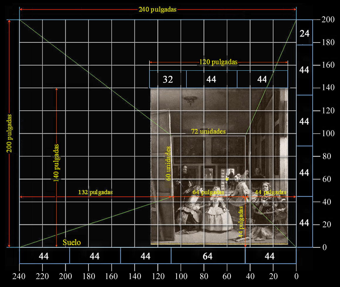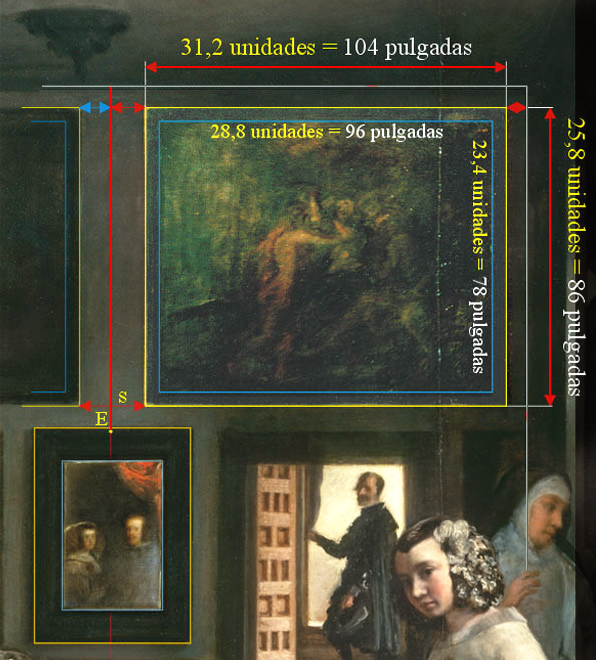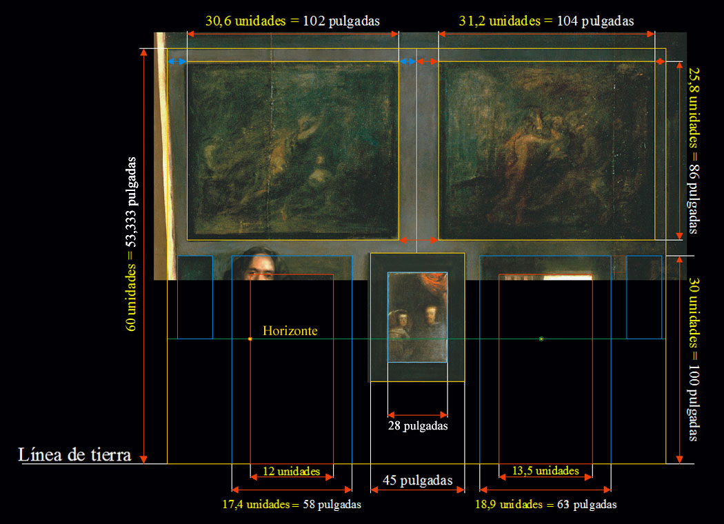 Las medidas exactas de la copia del pintor Mazo tienen la utilidad práctica de poder ser convertidas además en unidades, un procedimiento que nos facilitaría analizar a la pared del fondo de Las Meninas con rotundo verismo [2].