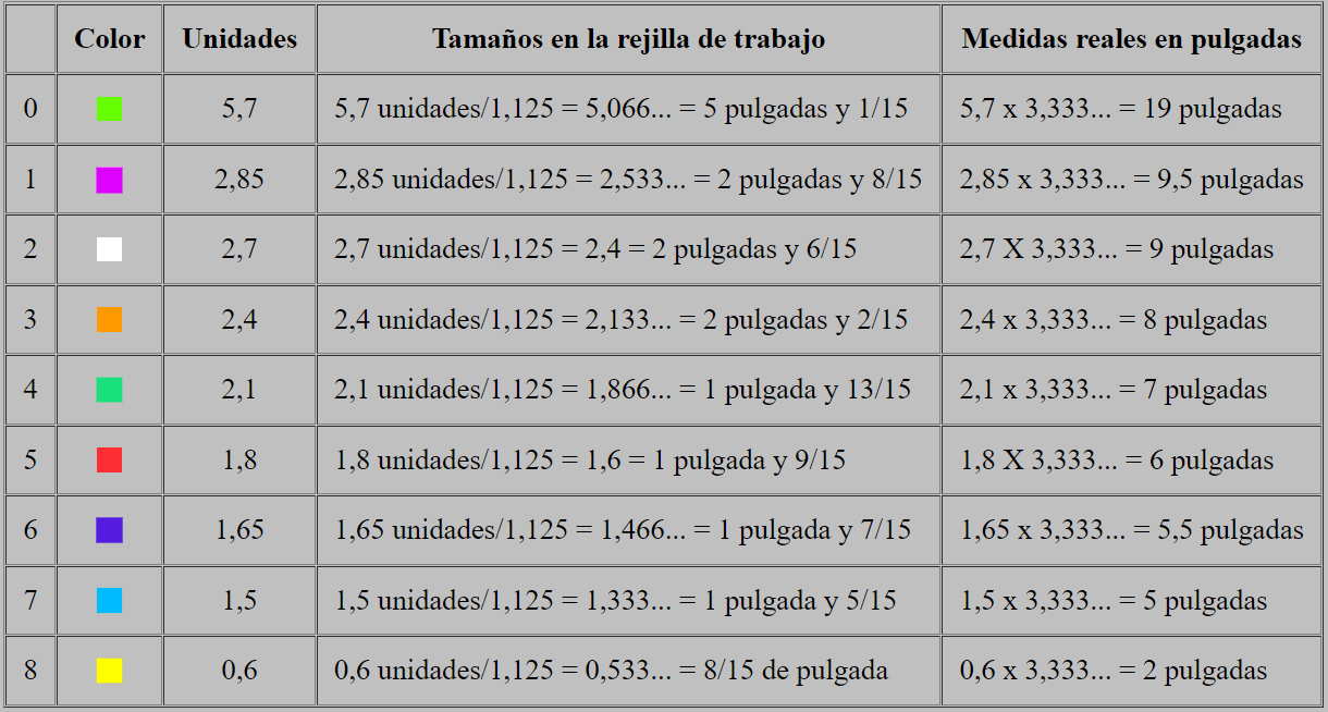 Cuando decimos que un cuadradito de 3 unidades de lado equivale a 2 pulgadas y 8 líneas, primero dividimos 0,279 metros entre 12, que da como resultado 0,02325 metros, y a esta cifra la multiplicamos por 2; que es igual a 0,0465 metros o 2 pulgadas.