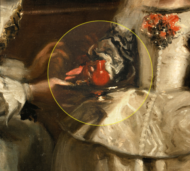 Y teniendo presente que la eclíptica queda representada a través del horizonte de este óleo, es de resaltar, pues, la jornada del Apóstol Santiago, día en el que fue bautizada la Infanta por el Nuncio de su Santidad en la Capilla Real, además de la marca del 24 de Junio, San Juan Bautista, sugerida en el suelo del pasillo con pinceladas de luz muy intensa sobre la vertical de la reposada mano izquierda de la Infanta Margarita, lo que hace posible considerar a la Infanta como consagrada princesa de Asturias, y, de puertas adentro, reconocida heredera del trono de Castilla.