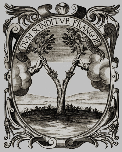 Un árbol ceñido con una corona partida, que representa al estado, es resquebrajado por dos brazos